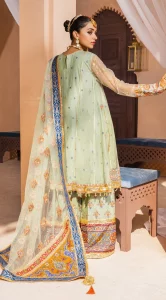 A serene mint green canvas is delicately accentuated with intricate floral and ornamental embroideries with an elaborately crafted neckline in exotic shades of orange, blue and gold. It is paired with a beautifully complimenting digitally printed gharara and an embroidered net dupatta that is adorned with complimenting embroideries and a contras ting cobalt blue border